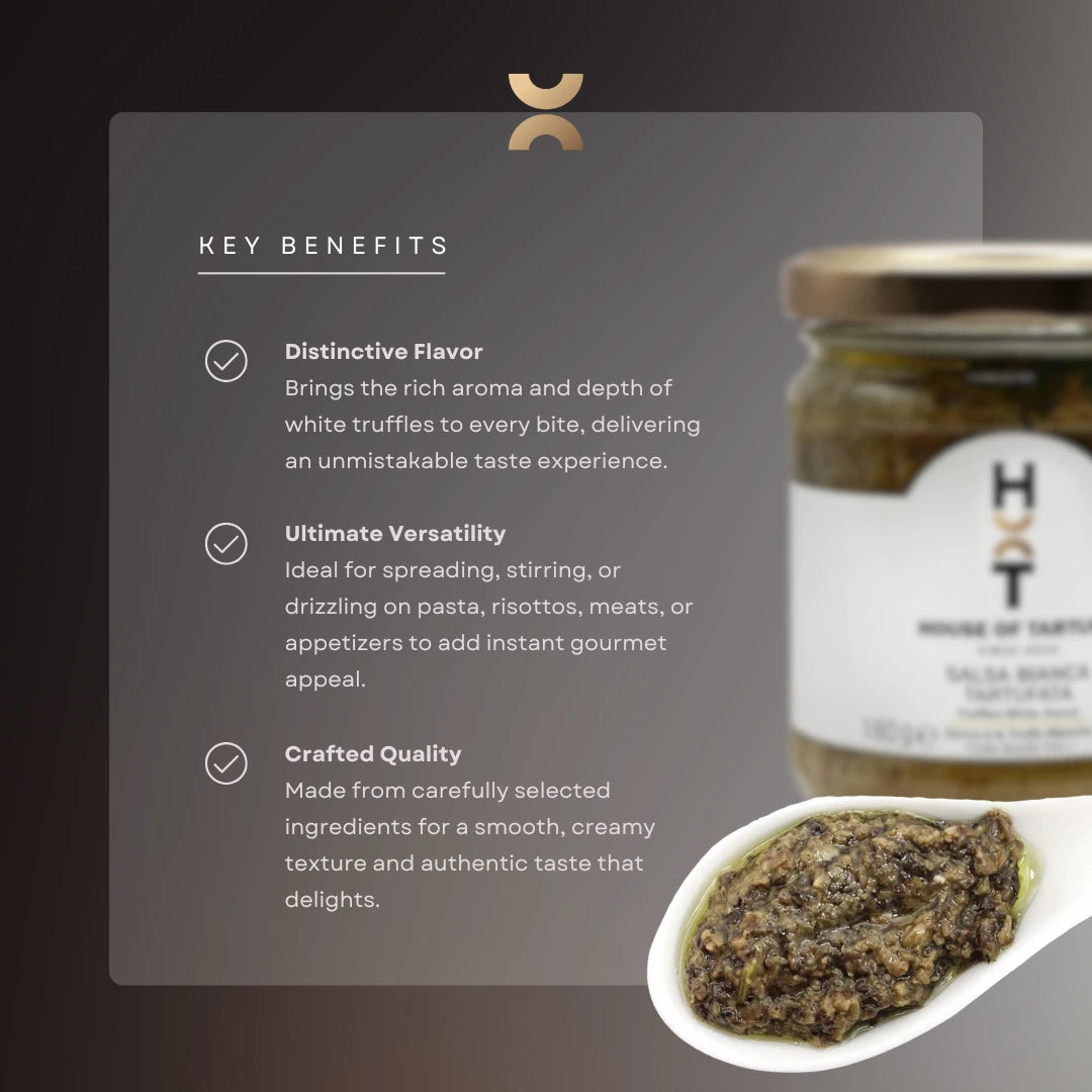 Creamy, refined and deeply aromatic, our White Truffle Sauce blends the natural essence of white truffle with premium champignon mushrooms. Crafted in Italy, it’s perfect for elevating everyday meals or professional recipes with elegance and flavor.